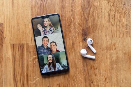 Flat lay of a phone lays on the wooden table, a few of people profiles on the screen, headphones near. App for video communication on phone screen, zoom on smartphone