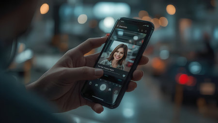 Video chat. Virtual meeting. Online communication. Digital office. Male hands showing successful business woman at workplace on mobile phone screen on blur background.