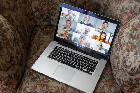 Laptop screen showing blurred faces of diverse people participating in an online video call or virtual meeting, representing remote work and global communication