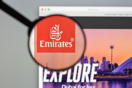 Milan, Italy - August 10, 2017: Emirates flights website homepage. It is an airline based in Dubai, United Arab Emirates. Emirates air lines logo visible.