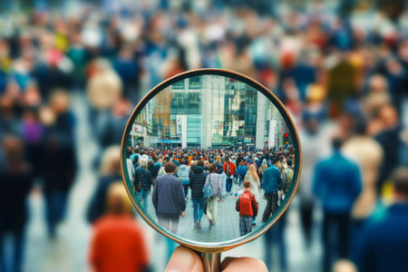 Magnifying glass focused on group of people at city street. Looking for person in crowd