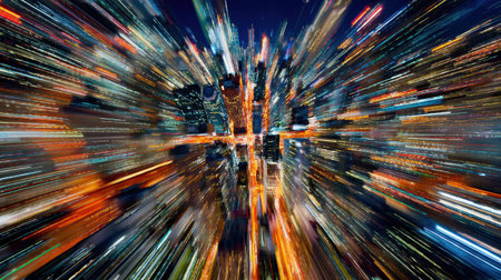A stunning view capturing the essence of a vibrant city at night, showcasing the energetic motion of lights and skyscrapers amidst a dynamic urban atmosphere.