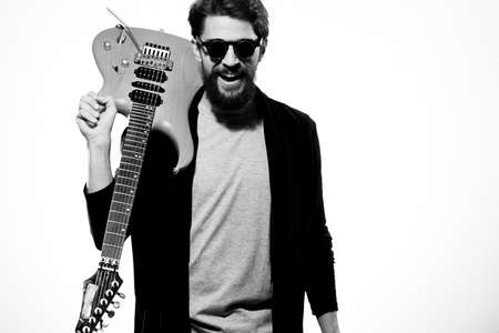A man holds a guitar in his hands black leather jacket dark glasses music performance light background