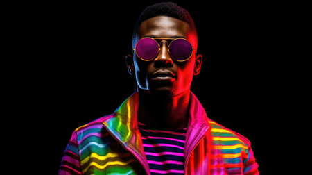A man poses confidently with sunglasses on, showcasing a fashionable outfit against a backdrop of vivid colors and artistic lighting. The setting reflects a contemporary and creative atmosphere