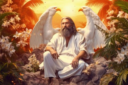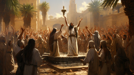 Jesus speaking to the people by parables on the mountain in the midst of nature Generative AI Illustration.