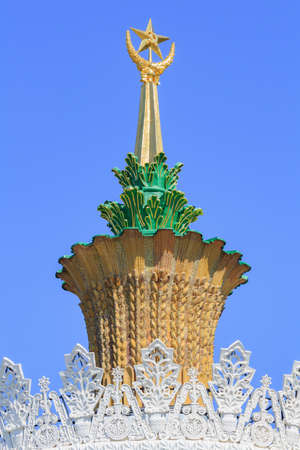 Moscow, Russia - August 01, 2018: Tower with gilded spire with soviet star closeup on the roof of pavilion Ukrainian SSR on VDNH in Moscow against blue sky