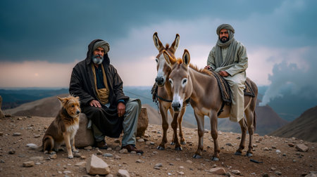 Two men riding donkeys accompanied by a dog on a rocky hillside under a cloudy sky