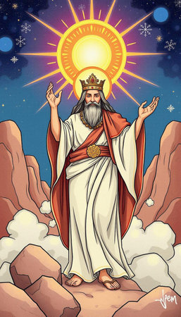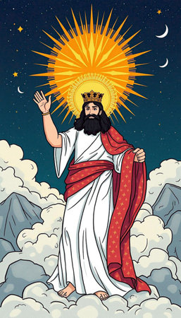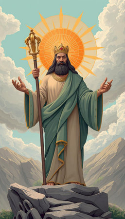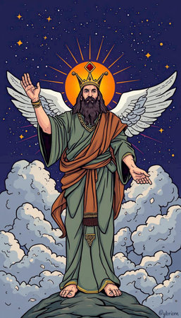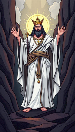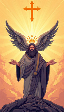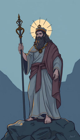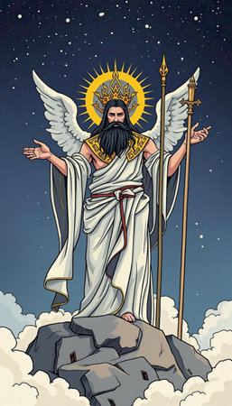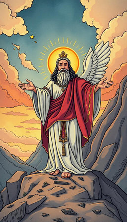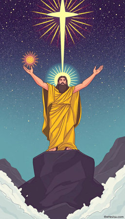 Artistic depiction of a haloed figure in robes standing atop a hill against a cloudy sky.