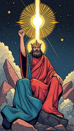 Majestic Elderly Caucasian Man Standing in Radiant Clouds Art. Concept of Power, Spirituality, Divine Presence. God.