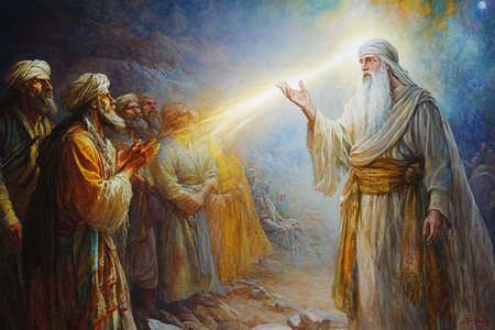 Prophet wearing a white robe and turban is sitting on a rock on a mountaintop, speaking to a large group of followers