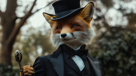 An elegant fox dressed in a top hat and tuxedo stands confidently while holding a cane in a tranquil forest background.