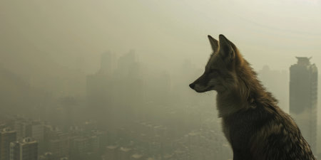 A fox is sitting on a ledge in a city with a foggy atmosphere. The cityscape is filled with tall buildings, and the fox appears to be looking out over the city. Scene is somewhat mysterious