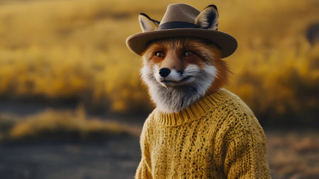 Portrait of a fox in a hat on the background of autumn nature.
