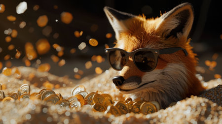 In the darkness, a 3D fox on vacation wears sunglasses, sifting through bitcoin sand, the savvy investor at play