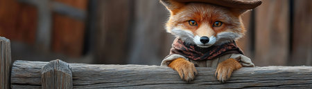 Fox cub dressed as cowboy beside wooden fence, photorealistic digital clarity