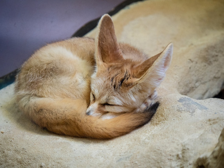 Sleeping Fennec Fox. Fennec Fox Sleeping on the Rock - Horizontal Photography. Fennec Fox is a Small Nocturnal Fox Found in the Sahara of North Africa.