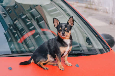 Dog, car, pet. companion dog sitting on the car. Chihuahua dog sits on the car.