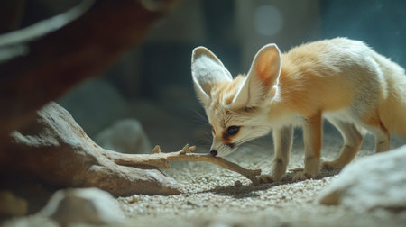 A fennec fox, with its large ears, curiously explores its natural habitat. Soft light highlights its delicate features as it sniffs a stick, embodying curiosity in the wild.