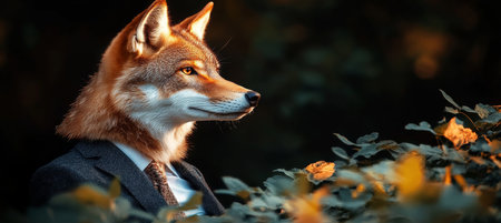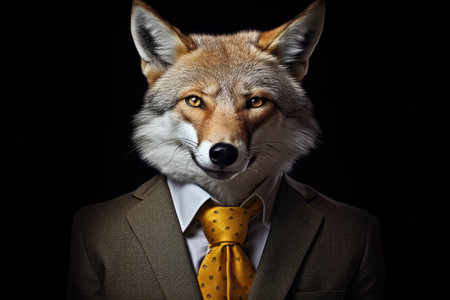 Wolf in Suit, Portrait of a Wolf in a Suit Against a Dark Background, Blending Animal and Human