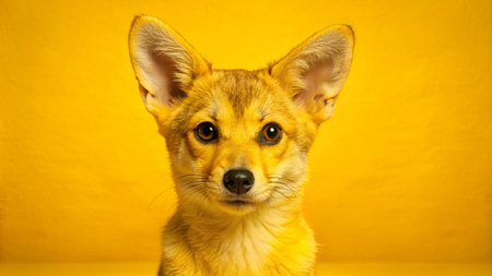 A cute fox pup with big ears looking directly at the camera against a bright yellow background.