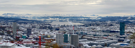 Panoramic aerial view of snow covered Zurich city Switzerland, snowy mountain tops in the background, no people