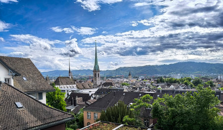 Panoramic View Of City Rooftops And Towers under picturesque sky. Zurich. Switzerland