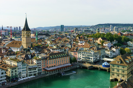 Zurich city center with famous Fraumunster, Grossmunster and St. Peter and river Limmat, Switzerland