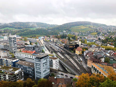 Aerial view of city rooftops and towers. Zurich. Switzerland.