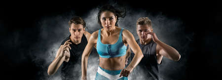 Sport collage. Man and woman on smoke background. Sports banner