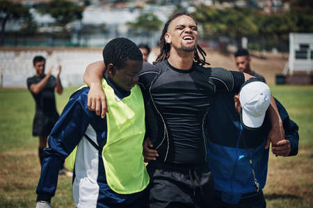 Thank God for first aid. a young rugby player being taken away by first aid attendants on the field.