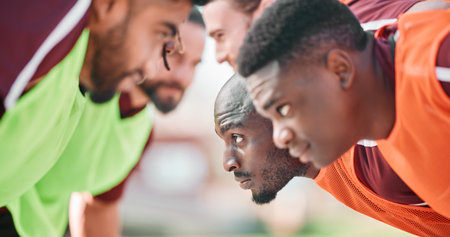 Rugby, scrum and team training, exercise or competition outdoor for game. Sports, fitness and serious group in match for performance, workout or strong men practice for healthy body together at field
