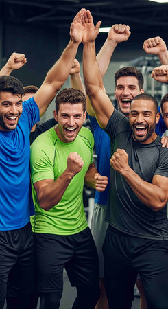 Male athlete joyfully celebrates victory with teammates in a sports hall, capturing the essence of teamwork, excitement, and camaraderie in a vibrant atmosphere, AI generated