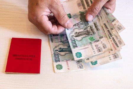 pension certificate, banknotes of 1000 rubles, the hands of a pensioner, The inscription on the certificate: 'pension certificate'
