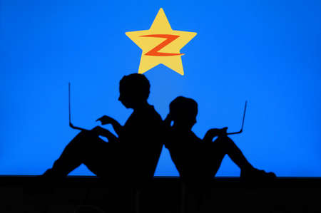 NEW YORK, USA, 25. MAY 2020: QZone social networking website based in China vChildren silhouette, sitting together and playing on their laptops. Company logo on screen in background