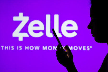 Zelle app icon. Hand with mobile phone with application. Mobile banking and investment concept photo