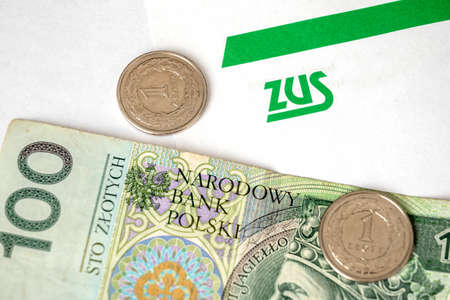 Gdansk, Poland - April 17, 2021: ZUS (National Social Insurance Company) logo on a sheet of paper and polish money