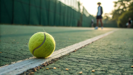 Vibrant tennis ball and racket are positioned on a court with a sneaker, illuminated by sunset, showcasing the energy and excitement of outdoor sports