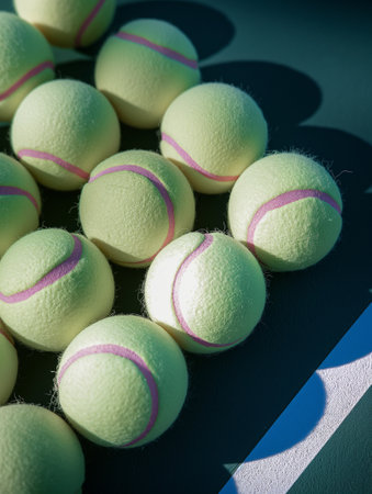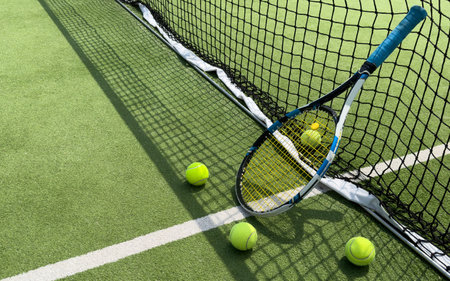 Capturing the Perfect Match: A Vibrant Tennis Racket and Fresh Ball Set on a Newly Painted Court