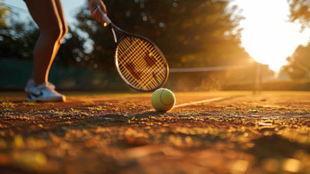 A detailed shot capturing a tennis ball resting on a sunlit red clay court, emphasizing its texture under a warm sunset.