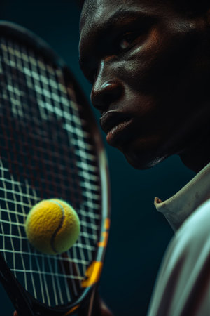 Focused Tennis Player with Racket and Ball in Motion in Dramatic Lighting.
