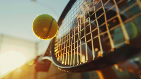 Tennis ball and racquet action shot at sunset