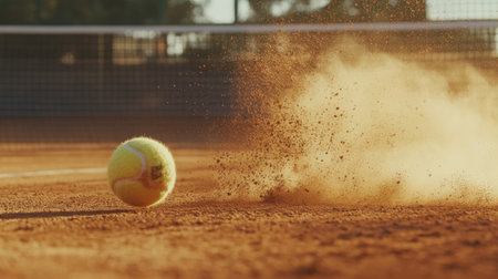 A vibrant tennis ball rolls on a dusty court, kicking up clouds of sand in motion, capturing the excitement of the game and the outdoor atmosphere.