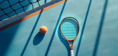 A tennis racket and ball set on a vibrant blue court, ready for a game or practice session.