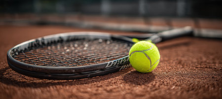 Tennis racket and ball close-up lying on tennis court. AI generative. Background for advertising or website.