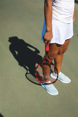 Low section of african american female athlete standing with tennis racket at court on sunny day. unaltered, sport, competition and tennis game concept.