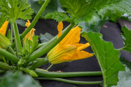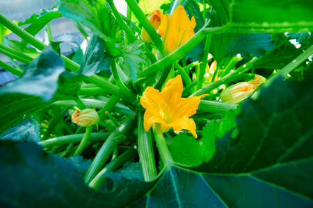 Yellow zucchini flowers growing in the garden. Organic vegetables plantation. Horticulture in cultivation greenhouse farm. Cultivation of zucchini, squash, pumpkin in farm field