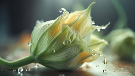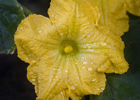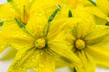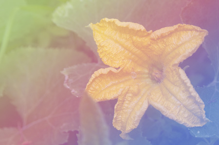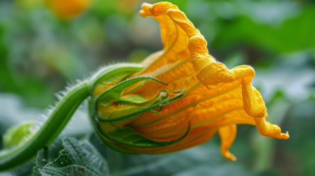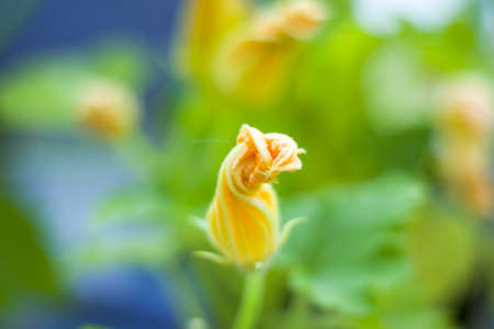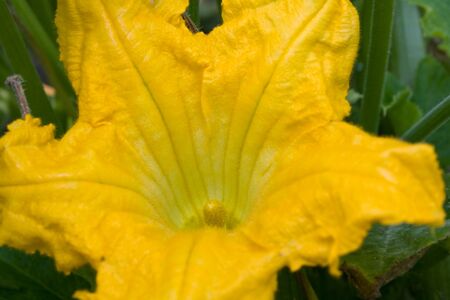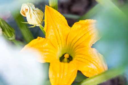 Zucchini flower macro and close-up, yellow and green colors background. Beauty in nature.