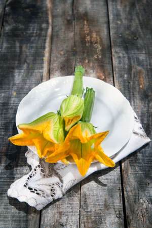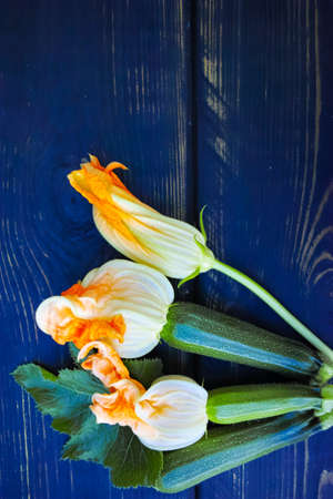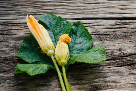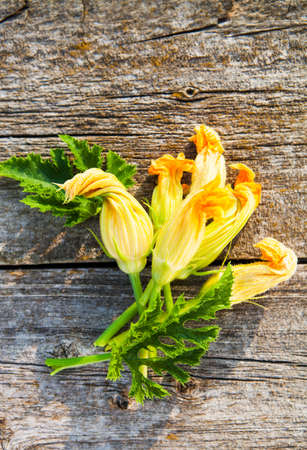 Zucchini flowers on a old wooden table close up, rustic style, selective focus