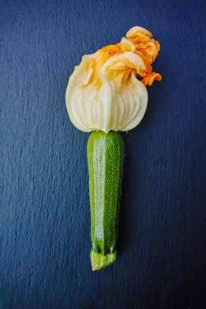 Single resh baby Courgette or Zucchini squash with blossom over a marble background. Image shot from top view.