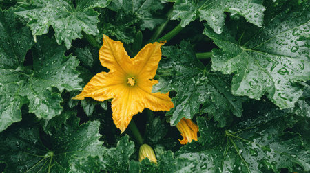 Close-up image showcasing a single yellow zucchini flower amidst a cluster of dark green leaves. Water droplets are visible on the leaves, highlighting the freshness and detail of the scene. The image captures the essence of a thriving garden, focusing on the beauty of the flower and the lushness of the plants.